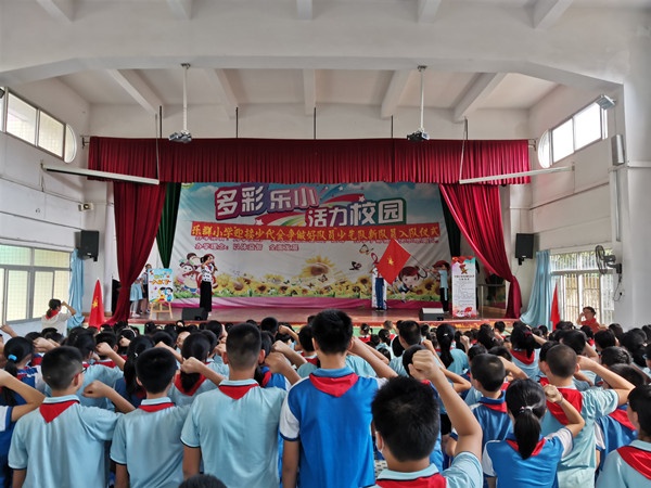 6月10日下午,乐群小学一年级预备队员、六年级优秀队员代表与辅导员老师齐聚学校礼堂,举行新生入队仪式。仪式在主持人热情洋溢的讲话以及全体队员齐唱《中国少年先锋队队歌》的歌声中拉开帷幕。