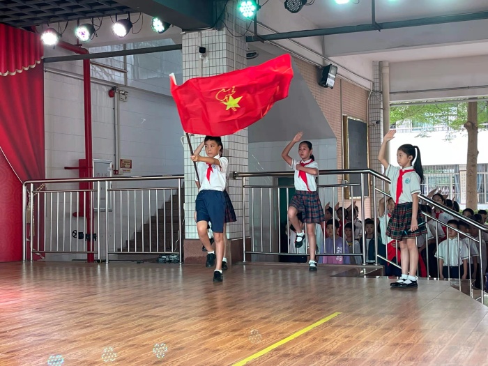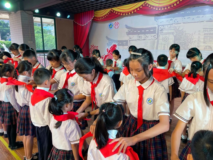 当大队辅导员黄笙宥老师宣读新队员名单后,六年级的哥哥姐姐作为代表为二年级新入队的弟弟妹妹有序佩戴上了鲜艳的红领巾,并互敬队礼,见证了新队员们成长中的重要时刻。飘扬在胸前的红领巾,不仅是“少先队员”身份的光荣象征,更是引领着新队员不断前行的火炬。接着,在大队长郑佩怡的带领下,全体队员在队旗下,骄傲地挺起胸膛、握紧拳头庄严宣誓:“我是中国少年先锋队队员,我在队旗下宣誓:我热爱中国共产党,热爱祖国,热爱人民,好好学习,好好锻炼,准备着,为共产主义事业贡献力量!”铿锵有力的宣誓声,表达了队员们向上的决心与意志。