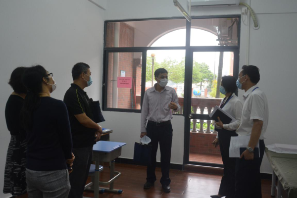 4月22日上午,由中山市教育和体育局、卫健局、市场监管局组成的学生返校疫情防控验收组莅临神湾育才学校开展验收工作。