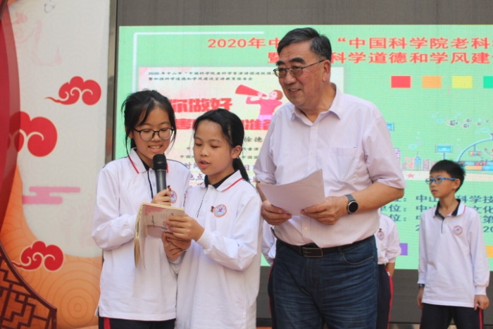 孩子们对科学家充满崇拜,这次能近距离听科学家讲课,都十分兴奋和珍惜。有的小朋友向两位教授送上自己写的一封信;有的向教授深深鞠了一躬;还有的勇敢地拿起话筒,向教授分享自己的心得体会。梁炳根校长、李慧冰副校长和李群婵主任也代表全校师生,为教授献上纪念品,表达敬意和感谢。