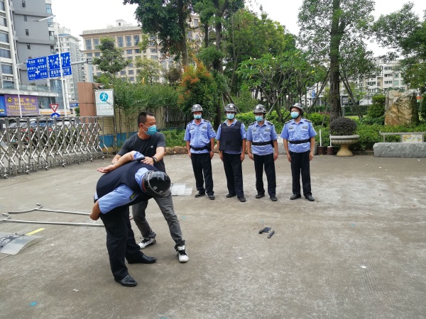 先由派出所民警现场技术指导学校保安当有“暴恐分子”冲进学校时,该如何运用钢叉、盾牌对暴恐分子进行拦截。钢叉可以用来勾腿、叉脖子、叉住腰,配合防暴盾牌非常有威慑力。在民警的耐心指导之后,石岐第一小学的保安们开始进行情景练习,当出现暴徒时如何更迅速有效地行动。多次练习后保安们逐渐掌握了有效制服暴徒的技巧。后在演练过程中,保安人员反应迅速、手持防暴棍、钢叉集中与 “暴徒”周旋,配合默契,采取处置措施及时、合理,表现出良好的处理危机事件的能力。