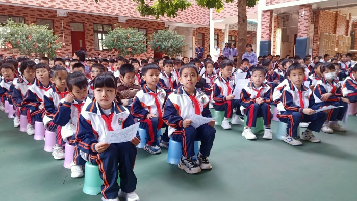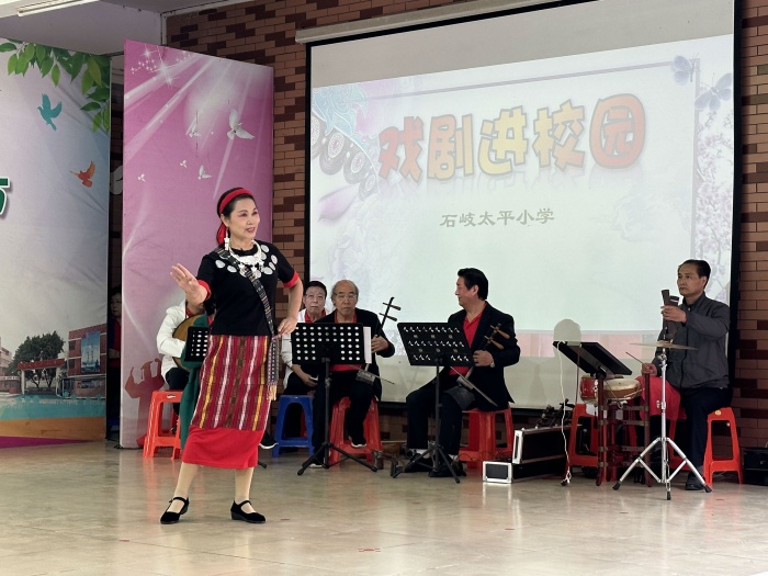 随后,中山市京韵京剧社的演员们纷纷亮相,为学生们展示了京剧曲牌《小开门》、京剧联唱:《红灯记》——“都有一颗红亮的心”、《红灯记》——“穷人的孩子早当家”、《海港》——“大吊车真厉害”、《龙江颂》“一轮红日照胸间”、《沙家浜》——“军民鱼水情”、《萧何月下追韩信》——“三生有幸”、《戴诺》选段“山风吹来一阵阵”、毛主席诗词《娄山关》、《梨花颂》、江姐《绣红旗》等经典京剧唱段,艺术家们通过唱、念、做等手段展示了剧中片段,让现场师生们深入感受到京剧声腔与表演的独特魅力。孩子们观看得津津有味,校园内传来一阵阵叫好声和雷鸣般的掌声。