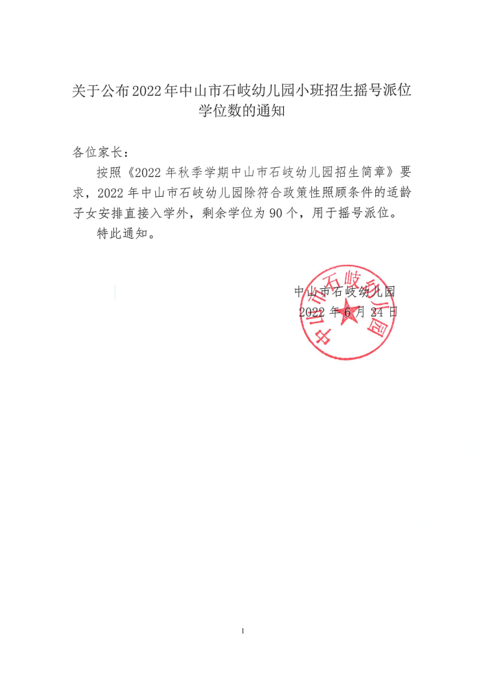 关于公布2022年中山市石岐幼儿园小班招生摇号派位学位数的通知