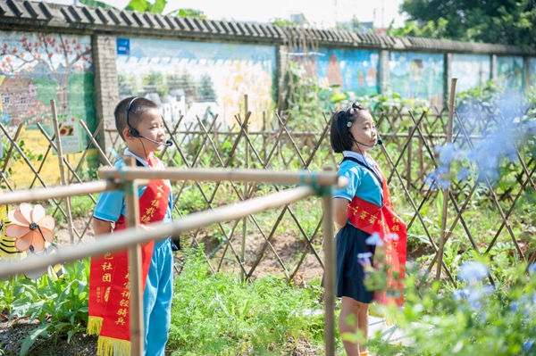 活动伊始,一行人在三乡镇载德小学毛义祥校长的带领下参观了该校的劳动教育实践基地。毛校长向大家介绍了劳动教育实践基地的建设理念、建设过程和建设成果。基地的蔬果、花卉生机勃勃,长势喜人,劳动教育成果扎实可见。