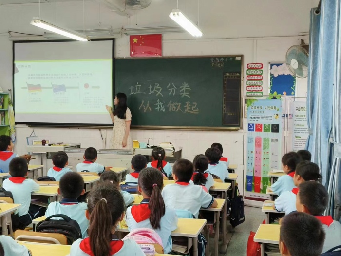 11月17日上午,首先由四(1)中队辅导员黄舜君老师为队员们上了一堂以“垃圾分类,从我做起”为主题的宣讲课。宣讲过程中,黄老师从垃圾分类的认识、做法、好处讲起,并介绍了可回收物、厨余垃圾、有害垃圾、其他垃圾四种垃圾分类,讲解最新的垃圾分类知识以及注意事项。随后,坦洲镇垃圾分类办的工作人员为队员们派发了宣传小册及环保袋,并让队员们参与到垃圾分类箱的活动小游戏中,在实践中增强环保回收的意识。