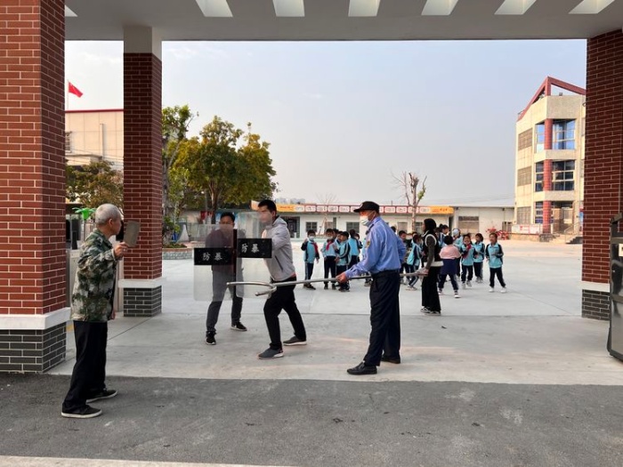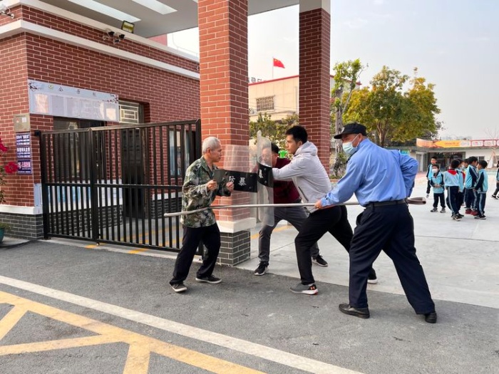 此次演练由校长亲自担任总指挥,演练内容包括“盾牌、钢叉、胶棍”等设备的使用方法、歹徒持械抢入校园时应对方法等几项内容。情景再现:2023年3月2日下午,学生们正在校园内进行课间活动,校园最小应急单元护学队伍携带防护装备器械,在校门外值守。发现有可疑人员靠近校门口,并对学生做出挑衅行为,护学队伍立即通过哨子警示老师、学生,同时通过拨打110、一键式报警等方式向公安机关及镇政府应急办报告。学校值班老师听到哨子后,第一时间也加入到护学队伍,采取有力措施制止违法犯罪活动的发生,尽量与嫌疑人形成对峙,等待救援,防止嫌疑人继续实施危害行为。