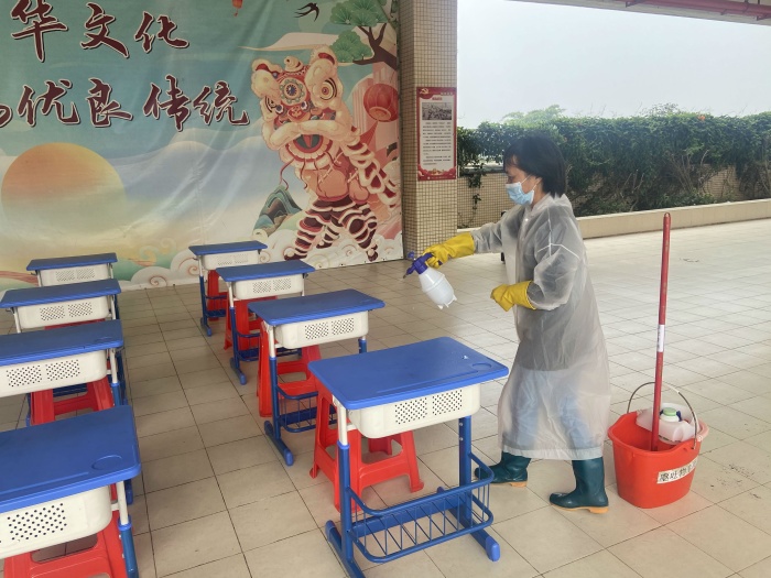 2月13日,学校组织后勤人员作开学前全面清洁和消毒,为防疫工作提供保障。