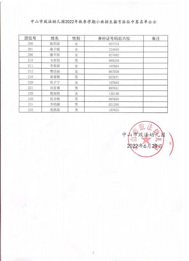中山市政法幼儿园2022年秋季学期小班招生摇号派位中签名单公示