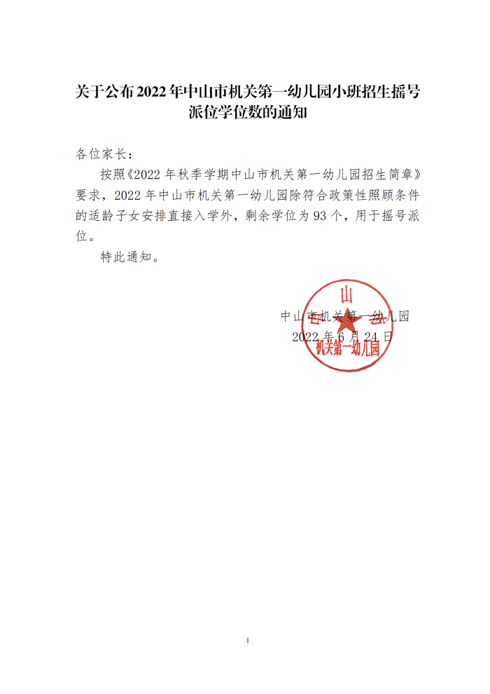 关于公布2022年中山市机关第一幼儿园小班招生摇号派位学位数的通知