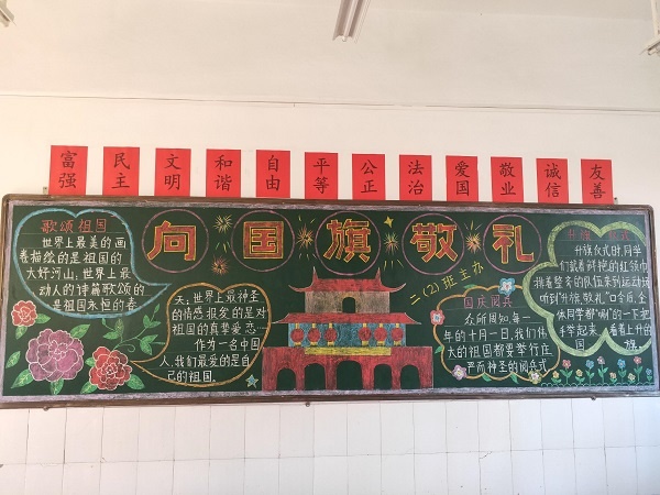 大队部还组织了一次“向国旗敬礼”为主题的黑板报评比活动。为了出好本次黑板报,各班同学们团结协作,怀着对祖国的热爱,同学们充分发挥自己的聪明才智,设计出一幅幅画面精美、布局合理、字体端正、内容详实、主题突出的黑板报。在这次活动中,增强了同学们的爱国主义情怀。