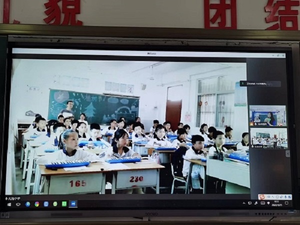 一根网线,一块屏幕,将相距四百多公里的两校师生紧紧连在一起。姚敏凤老师的口风琴课教同学们认识口风琴、学做手指操、学习手型、认识键盘、学习呼吸并且学习吹奏歌曲《摇啊摇》。潘玉迪老师的《吃瓜果的人》美术课,深深吸引了大沟小学二年级的同学们,用欣赏小朋友吃瓜果的表情视频进行课堂导入,通过讲解知识点、微课讲解绘画步骤及教师示范教同学们画吃瓜果的人。两节艺术课带给大沟小学的同学们以别开生面的体验,孩子们兴趣盎然、乐在其中。