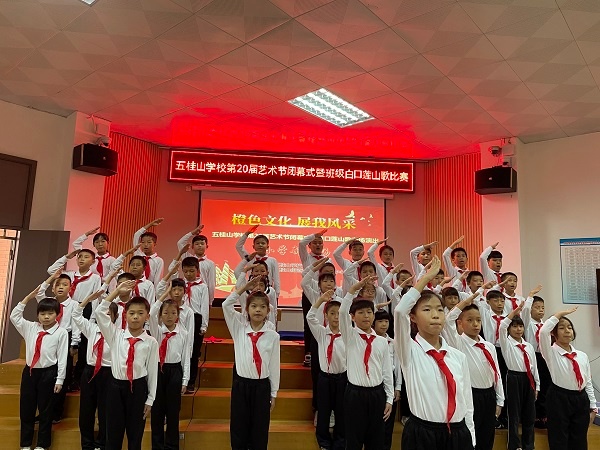 为弘扬爱国主义精神,丰富学生的校园文化生活,五桂山学校围绕“五色教育”之橙色文化教育,开展了为期一个月的第20届艺术节系列活动。11月4日上午,五桂山学校第20届艺术节闭幕式暨白口莲山歌专场活动在小学部阶梯室举行,活动以“歌颂伟大祖国,肩负神圣使命”为主题开展班级红歌比赛。