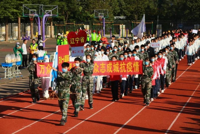 初一年级同学们身着各种职业服装,致敬医生护士、社区疾控、公安民警、交通警察、消防警察、快递小哥、物流司机、送菜农民、建设工人、北斗导航工程师、5G技术人员工人、化身主播实施线上教学的老师、志愿者……口号、横幅、展板等将他们的故事展演,向伟大的时代英雄致敬。