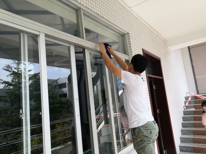 夏日炎炎,志愿者们齐心协力、热火朝天,衣衫早已被汗水湿透,脸庞已被晒得通红。经过三小时的辛勤劳动,人行道、走廊、绿化带、停车场、体育馆、教学楼、办公楼都被清理得干干净净。
