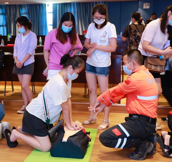 心肺复苏是通过胸部外部压力在胸部和内部之间形成压力差,维持血液循环能力,并且在人工呼吸后向脑和心脏供应血液以维持生命,具体操作步骤为检查伤病者的反应、高声求助、打开气道、检查呼吸、施行胸部按压、灌气2次,再观察心肺复苏的有效指征。在场的家长志愿者认真聆听,很多志愿者对体验环节都是跃跃欲试。