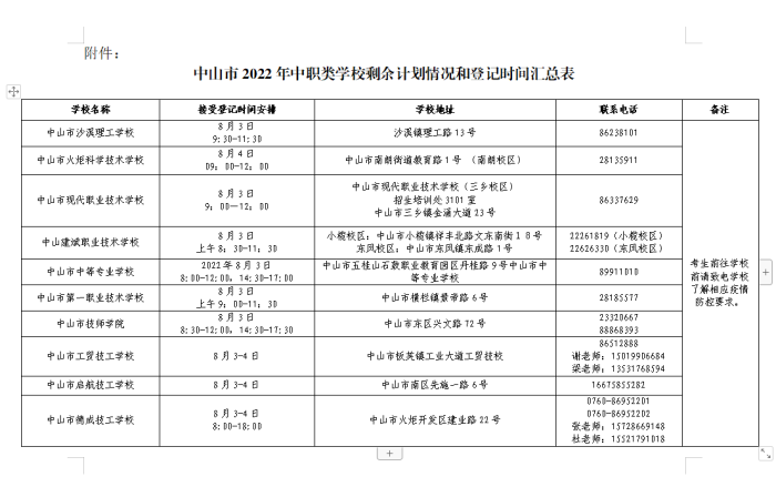 我市2022年中职类学校统一录取已于7月29日结束。根据各中职类学校目前注册报到的情况,仍有部分专业有少量剩余计划,经研究决定,尚未被学校录取且有意向就读的考生,可携带身份证、我市中考准考证到相关学校办理就读申请,各个学校的登记安排详见附件。
