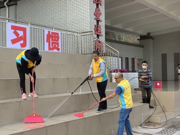 随后,各支部各党员志愿者秒变“铁道游击队”“丛林英雄”“冲锋卫士”,开展“文明典范城市,推动中山高质量发展——中山市第二中学在行动”志愿服务活动。第一支部全体党员对校园宣传栏、花基、树基、草坪等卫生死角、盲区进行清除,全域、全方位提升校园环境品质。第二党支部对全校各个区域的下水道进行卫生清扫,全体党员干部纷纷拿起手套、扫帚、铲子等工具,捡拾、清理下水道垃圾、树叶。第三党支部围绕校园里图书馆区域与第三教学楼的相关区域的一些卫生死角开展卫生清洁和整理。各位党员同志们身着黄马褂,精神饱满、热情高涨,手持扫帚、拖把,铁锹等清洁工具,走进相关负责区域进行环境卫生大扫除,清理楼道杂物、清理卫生死角,用实际行动弘扬雷锋精神。经过一个多小时的奋斗,各小组负责的区域卫生面貌得到极大改善。第四党支部负责学校运动场及周边区域。党委书记王曙东同志带头示范,拎着垃圾桶围绕学校操场,不放过一个角落地进行垃圾分类回收。见到操场看台需要清理,王曙东同志挽起袖子裤腿接过水枪,一层一层地清理。第四支部的党员同志干劲足,积极性高,有的同志清理排水沟,垃圾堵住了出水口,就亲自用手去清理排水沟的垃圾,不怕苦、不怕脏;有的同志擦栏杆,有的同志拖地,有的同志耐心地一个一个地摆好足球框,有的同志用沙耙清理沙池杂物垃圾。在滚滚的烟尘中,同志们不怕辛劳,弘扬雷锋精神,打扫好清洁好整理好自己的区域,用自己的实际行动,创造一个整洁优美的校园环境。