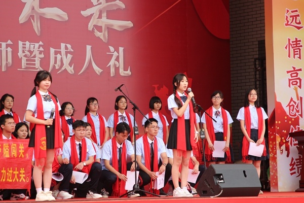 正心立誓,赓续华章。成年不仅意味着年龄的变化,更意味着社会角色的转变,领导嘉宾们、家长们为学子戴上成人徽章,披上红围巾、赠送《中华人民共和国宪法》。以梦为马,挑起责任担当。在庄严的氛围中,团委副书记钟李斌带领全体高三学子进行了郑重的宣誓。