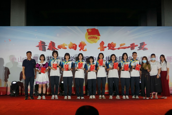 喜迎二十大,永远跟党走,奋进新征程。为迎接党的二十大胜利召开,庆祝中国共青团成立100周年,激发青年学生爱党爱团的热情,展示积极向上的青春风采,7月7日,曹步初级中学在学校正门广场举行以“青春心向党,喜迎二十大”为主题的庆祝中国共青团成立100周年暨2022年“明德之星”颁奖典礼。全体师生、特邀嘉宾、部分家长参加此次的颁奖仪式。