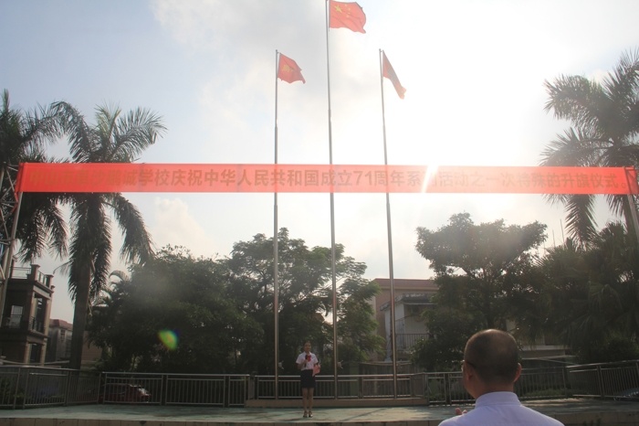 为庆祝中华人民共和国成立71周年,弘扬爱国主义精神,激发师生爱国情感、报国之志,中山市阜沙鹏诚学校于2020年9月30日上午,举行了庆祝中华人民共和国成立71周年系列活动之一次特殊的升旗仪式。