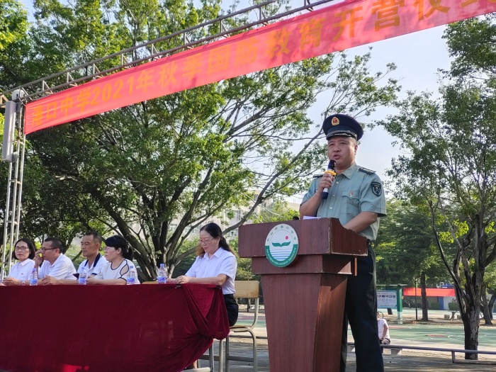 为了强化学生的国防意识,进一步培养学生的爱国情操,增强班集体的凝聚力和向心力,提升学生健康的身心素养,2021年10月11日,中山市港口中学初一新生举办了国防教育开营仪式。教育和体育事务中心刘宪军主任、镇武装部副部长贺洪彪先生、学校廖志坚校长携同全体行政、初一各班班主任出席了本次活动。