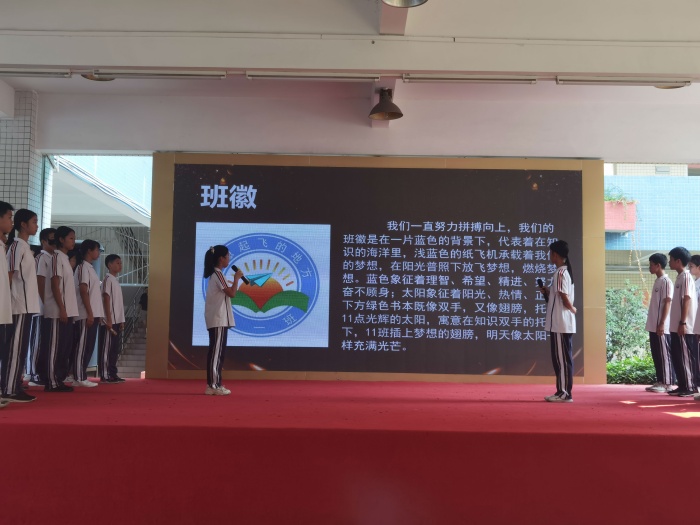 巡展班级按照“班名展示”、“班徽展示”、“班级口号、目标、誓词展示”、“小组文化展示”、“班级文化布置展示”、“班级特色才艺展示”、“班歌展示”等基本流程进行展示。各班同学充分发挥聪明才智,精心设计班名和班徽,制定班规、公约和奋斗目标,展示本班的特色和风采。