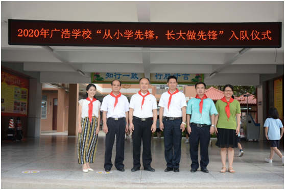 队旗飘飘,星星火炬闪耀,为庆祝“六一”儿童节,2020年5月29日早上,中山市广浩学校少先大队部组织一年级学生举行隆重的“从小学先锋,长大做先锋”主题入队仪式。广浩学校党支部书记杨善德、少工委主任黄飞跃、德育处许向阳主任、梁超胜主任、团委莫欣老师、少先大队辅导员陈燕坪老师出席了入队仪式。