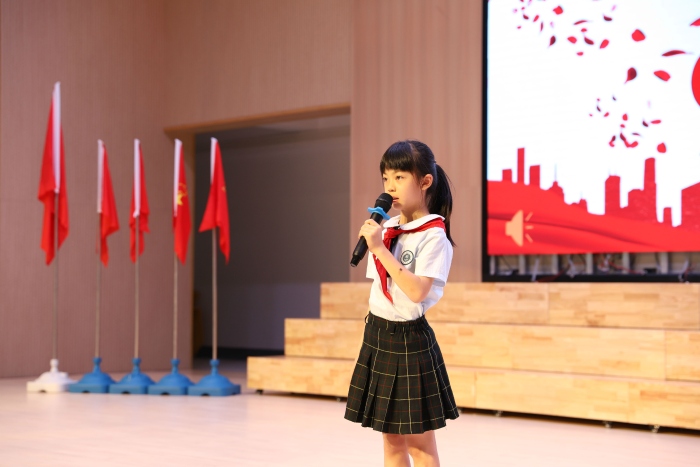 在庄严的出旗曲中,入队仪式拉开了帷幕。旗手们踏着整齐的步伐,精神抖擞地护送队旗向前迈进。在鲜艳的队旗下,同学们高声齐唱《中国少年先锋队队歌》,嘹亮的歌声中充盈着对中国共产党、中国少年先锋队坚定的拥护。