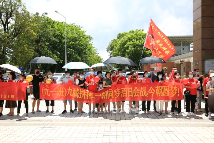 下午,炎热的天气挡不住师生和家长的热情。13点30分,学校南大门挤满了前来送考的家长们,他们挥舞着写有“傲视群雄、考出佳绩、中考胜利”的旗子,身着印有“旗开得胜”字样的送考服、旗袍,各班家委还精心制作了加油横幅,为考生加油。