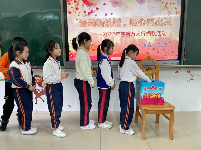 此次慈善万人行活动主题为“爱满新铁城,岐心再出发”。在郑结霞校长的引领下,学校的行政班子与老师们也齐心协力为慈善事业献出一己之力。这一小小举动,为学校的慈善万人行捐款活动开了好头。虽然秉承着自愿捐款,以力所能及之力奉献爱的原则向孩子们发出倡议,但正如本次活动主题那般,整个爱心捐款活动收获了孩子们满满的爱心。此次活动以班级为单位进行,利用大课间时间,由班主任主持此次的活动。活动进行期间,看着孩子们将提前准备好的零钱迫不及待地平铺在课桌上,满脸笑颜地等待着自己走上捐款箱的那一刻。有的经过深思熟虑掏出自己珍藏多时的压岁钱献上爱心;有的则是和父母商量着从买零食、玩具的零花钱中拿出一部分出一臂之力;而有的孩子更是和父母一起为爱助航。看着那一张张被他们拽得有点皱巴巴的零钱,再看看他们脸上那幸福与满足的笑脸,由衷为每个孩子心中的那份天真且简单的爱心而感动。