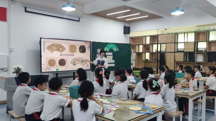 陈康尧老师接着执教《夏日的凉风》第二课时一一扇面绘画课。陈老师通过《扇诗》导入,让学生找到扇子的实用功能和装饰功能,再通过讲述《右军书扇》的故事来了解好的扇面是可以提升扇子的价值;接着让学生了解扇面的艺术类型并欣赏了三张中国传统扇面。接下来通过比拼小游戏让学生找出夏日的元素,从而定下绘画内容,然后让学生区分凉快和炎热对应的颜色的颜色一一冷色和暖色,最后观看视频掌握绘画步骤后开始创作。学生用线描画的方式体现夏天的元素,扇面作品线条流畅优美、色彩丰富,充满夏日趣味。课后拓展为学生介绍了世界上最贵的扇子一一《白桃小禽》,以及其他扇子的衍生品,并布置了课后欣赏作业。