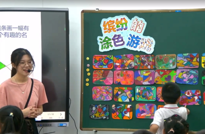 张靖贤老师执教的《缤纷的涂色游戏》是岭南版美术书一年级下册第四单元“迷人的色彩”中的一课,在教学过程中,她主要侧重认识色彩、感受色彩、利用线条和色彩进行造型;培养学生关注自然美,色彩美的能力。张老师通过色彩游戏激趣,认识生活中的色彩,欣赏《高原牧归》、《玛修的梦》、吴冠中的绘画感受线条和色彩、认识三原色,解决了本课重点,鼓励学生大胆绘画出心中感受。学生观看老师微课视频,学习耐心涂色,给自己的画取一个有趣的名字,激发了学生想象力,画一幅有主题的画,完成了本课难点。老师鼓励学生多观察生活中的色彩,并大胆用点线色表达自己的感受。