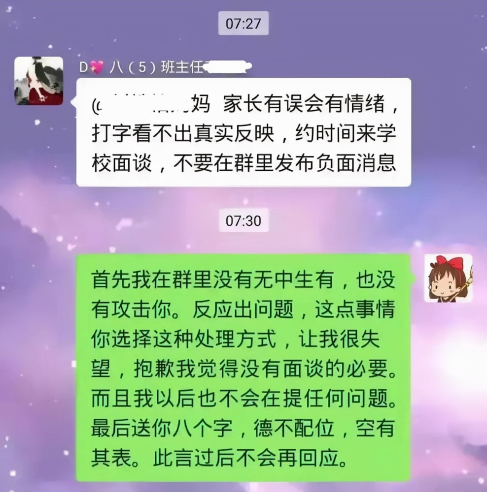 老师邀请这位家长去学校面谈,家长丢下一句狠话:“德不配位,空有其表。”