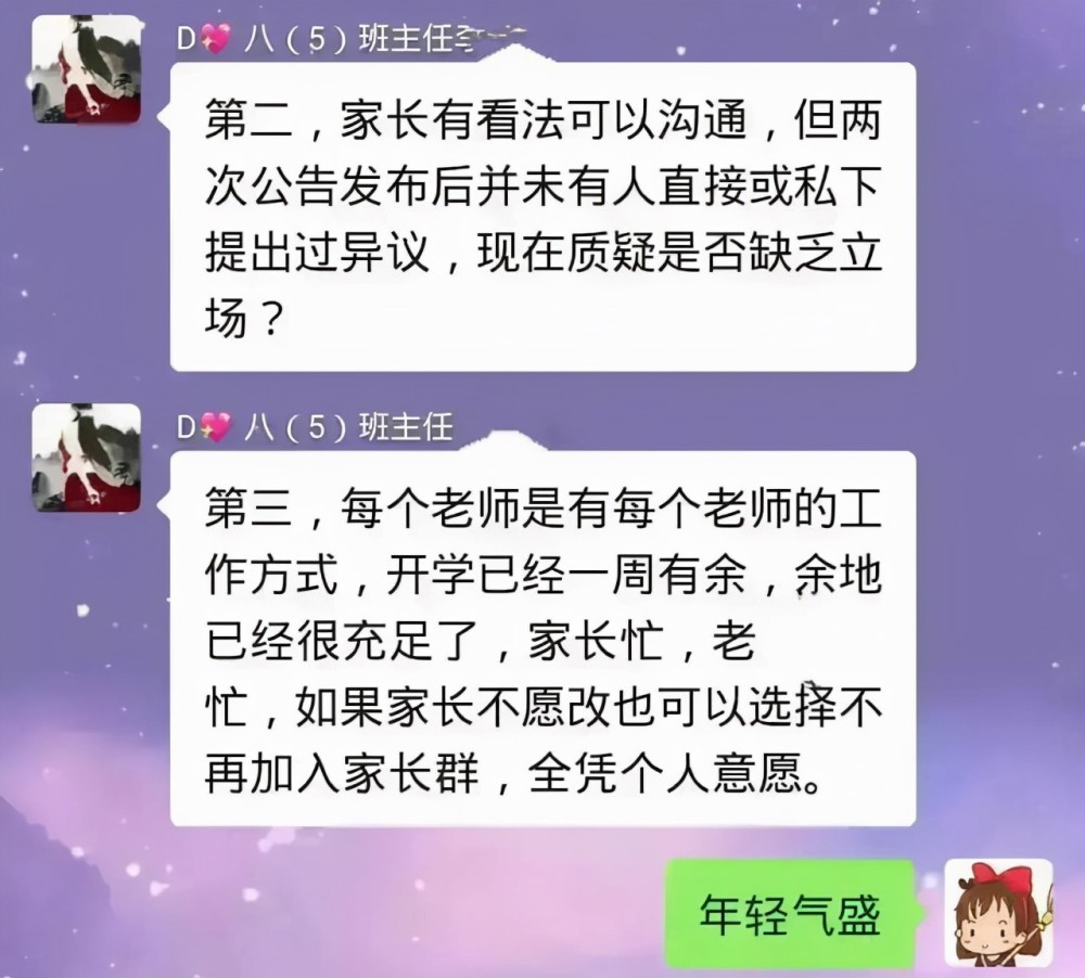 我觉得从来没有家长会恶意揣测、拒不配合老师工作,但是班主任和班主任的行事风格是不一样的, 像这位和老师抬杠的家长,用前班主任的行事风格要求新的班主任,未免太苛刻了。
