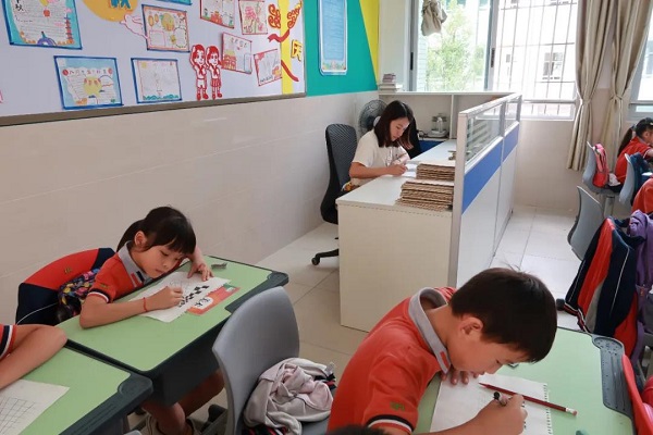 “对低年级的孩子来说,班主任还是有一定‘威力’的,平时哪怕巡堂时从窗外经过他们都会认真不少,更别说现在我们坐在后面办公。”施燕霞说,她认为,低年级学生自制力不强,上课注意力不够集中,班主任坐班则可以有效解决这个问题。