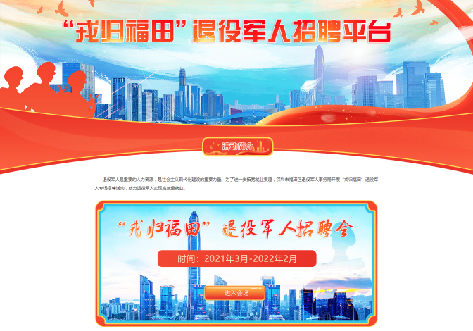 为充分发挥退役军人的人才资源优势,满足疫情防控常态化期间广大退役军人的就业需求,拓宽市场化就业渠道,福田区在促进退役军人就业创业领域再出实招,由区退役军人事务局携手主流人力资源机构智联招聘,在全市首创退役军人线上招聘专区——“戎归福田”退役军人招聘平台,通过举办线上招聘、政策宣传、求职微课堂等系列活动,为退役军人们提供线上一站式就业服务,全力打造具有福田特色的“戎归福田”退役军人就业创业新名片。