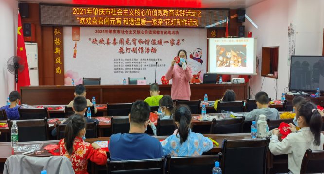 2021年2月20日,广东省肇庆市端州区黄岗街道组织街道工会、团委、妇联、关工委、文化站等部门,联合肇庆市文明办等结对共建单位,诚邀辖区20多名留肇过年务工人员家庭的儿童集结黄岗街道文化站,共同举办了2021年肇庆市社会主义核心价值观教育实践活动之“欢欢喜喜闹元宵•和谐温暖一家亲”主题花灯制作活动,为传统的元宵佳节添乐趣。