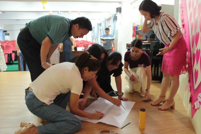 第二环节是团队建设和挑战。全体教师被随机分成7个小组,每个成员集思广益,共同为自己的小组取队名、想口号、编展示动作。特别在“共同创作一幅画”这一活动中,每个小组的凝聚力、向心力在挑战面前被激发并无限放大,大家全身心地投入到创作中,群策群力、团结协作,在短时间内出色地完成一幅幅饱含情怀、寓意深长的作品。各团队精彩而忘情地诠释作品的内涵,掌声伴随着感动阵阵响起,团队凝聚力在这一刻被激发了。