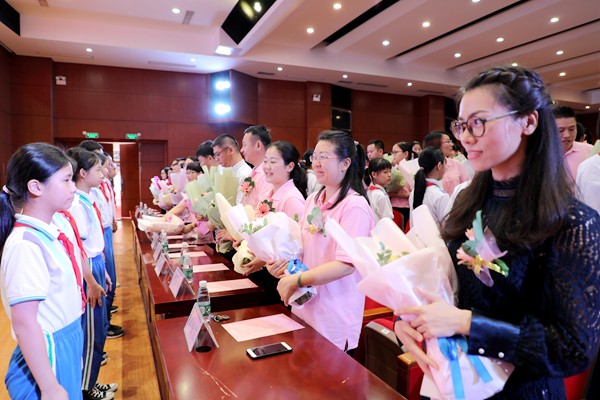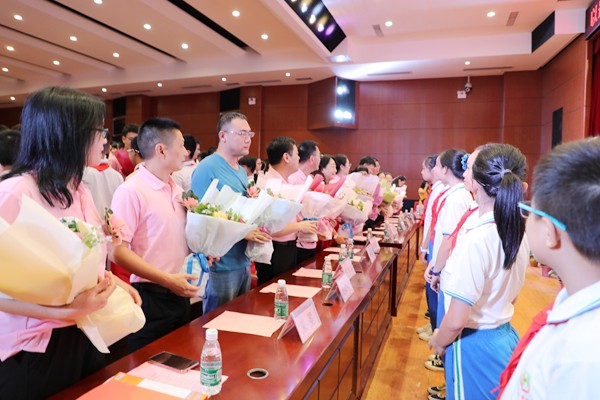 典礼在毕业生表演的诗朗诵《毕业之歌》中拉开了序幕。学生们精神饱满,随着舒缓的音乐,深情款款,道出了对老师的感恩,对母校的眷恋,对同学的不舍。为了表达对老师们的感谢,同学们给全体六年级老师献上鲜花与祝福,全体学生齐声高喊“老师谢谢您,老师您辛苦了”。饱含深情的声音回荡在大礼堂,寄托了孩子们对老师的感恩和不舍。