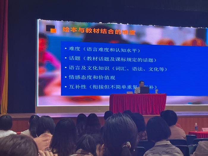 然后,程教授带来了“英语教学中拓展语篇资源的开发与利用”为题的讲座。程教师从为什么要开发和利用拓展语篇教学、拓展教学资源的定义、跨教材资源的优势、小学开展绘本教学的意义等方面向大家阐述了在英语教学中拓展语篇的开发与利用的作用以及优势。最后,中山市小学英语教研员辛建老师也就语篇资源的开发和应用的背景和开发原则方面进行了简单的阐述。