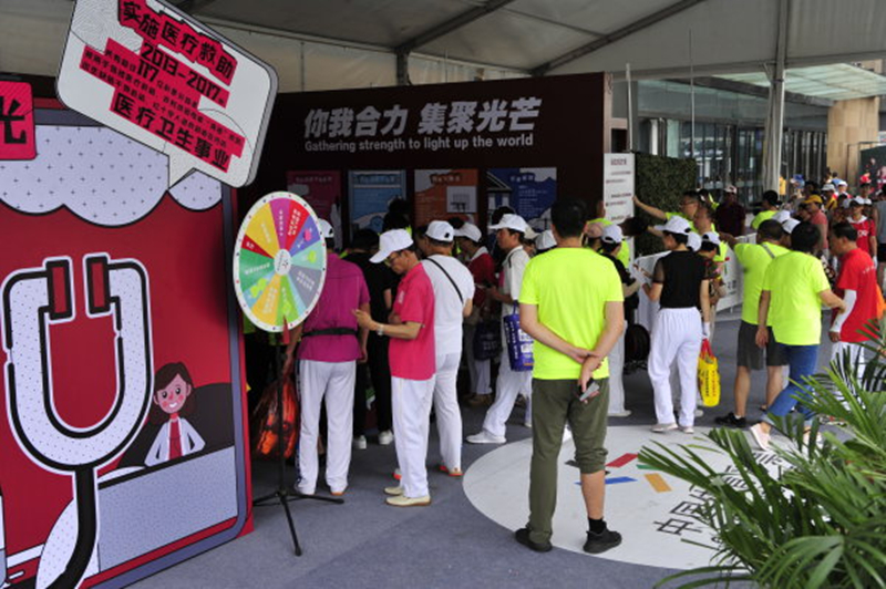 大家最热衷的游戏就是通关打卡4个项目,领取消暑纪念品。这4个项目的第一项就是与25周年主题墙合影转发朋友圈,虽然现场人很多,但在体彩志愿者的引领下,活动进行得平稳有序。