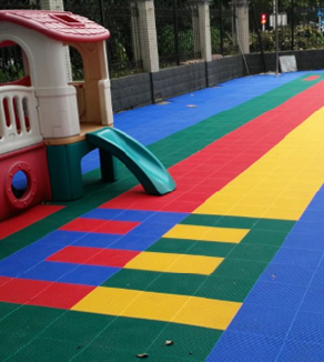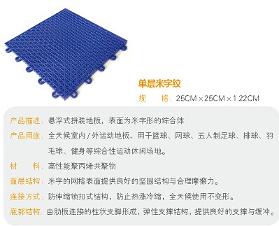 与硬质地面相比,拼装地板具有良好的安全性、减震性和反弹力,很好地实现垂直吸震及能量回送,侧向缓冲,防滑,防运动损伤,有效保护运动者的运动安全,充分发挥人体运动潜能。采用原料聚丙稀(PP)为高强度材料,无毒环保。