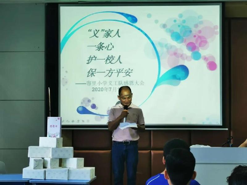 首先,赖主任代表学校做了以“义家人,一条心,护一校人,保一方平安”为主题的义工队管理情况汇报,从“尊重、构建、投入、打造”四个方面具体表达了学校对义工队的支持和感激。