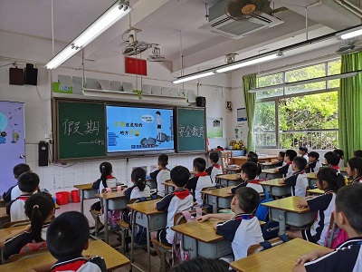 首先通过雷州市附城中学学生的溺水事件,建议同学们尽可能不要去周围的水域玩耍,并通过视频引导学习发生溺水后如何自救与施救呢?有哪些防溺水安全知识?随后讲述山东省青岛某高校一名大四学生因轻信网友造成自身财产损失的事件,提醒各位同学上网要谨慎,不能轻信陌生人。紧接着通报一则近期亡人火灾事故,再次强调安全用电用火的重要性。最后补充疫情期间不聚集、迷路该如何做等问题,提高全体学生对安全的重视,学会保护自己。各班同学在老师的引导下,认真专注地学习。