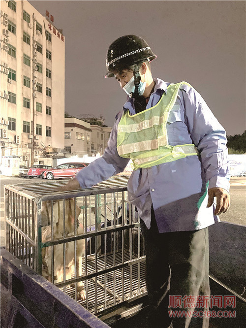 12 月16 日晚,顺德区城市管理和综合执法局联动十镇街分局开展了区镇两级文明养犬执法行动。图为执法人员安抚被抓捕的金毛。